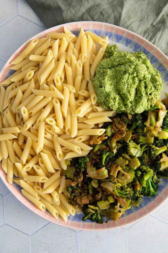 - Sobald die Nudeln gekocht sind diese abgießen. Eine Tasse Kochwasser auffangen. Die Nudeln in die Pfanne mit dem Brokkoli geben. Das Pesto dazu geben und etwas Kochwasser dazu geben, sodass sich alles gut vermischen lässt und sich eine cremige Soße bildet.