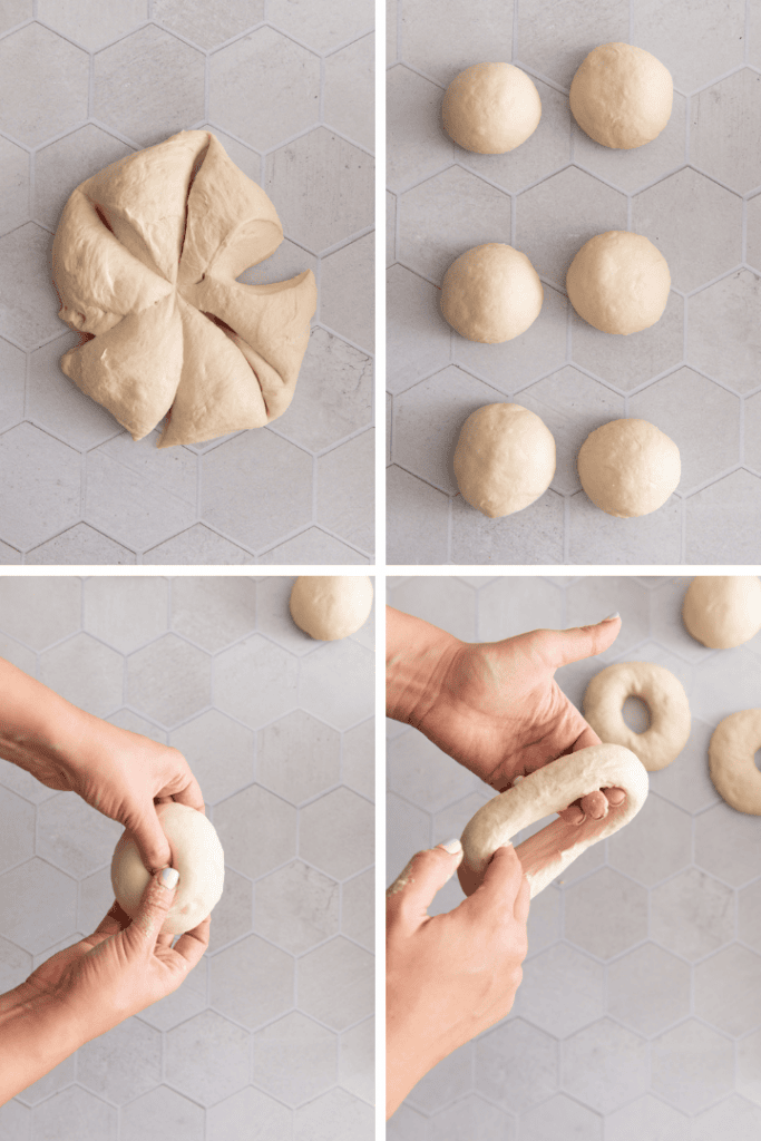 Teile den Teig in sechs gleich große Portionen. Forme die Teigportionen jeweils zu einer gleichmäßigen Kugel. Drücke nun den Daumen durch die Mitte jeder Kugel. Fädle dann deine beiden Zeigefinger in das Loch und dehne durch rotierende Bewegungen den Teig zügig, aber vorsichtig zur Bagel-Form. Das Loch darf ruhig 5 cm im Durchmesser haben.