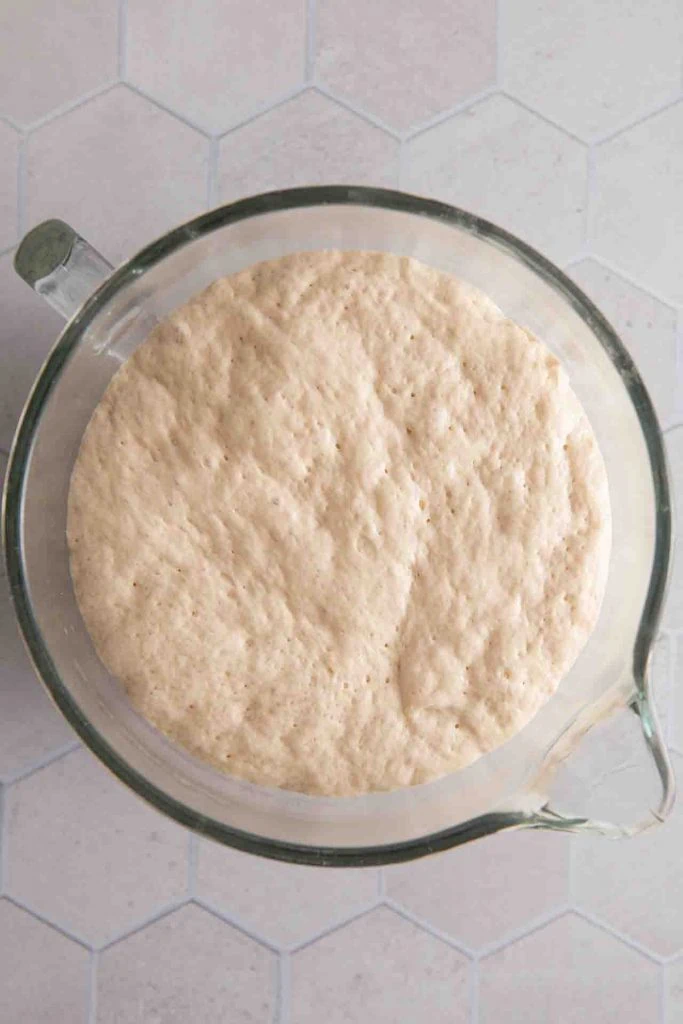 - Den Teig abgedeckt an einem warmen Ort für ca. 1 Stunde aufgehen lassen, bis sich das Volumen mindestens verdoppelt hat. Alternativ kann der Teig auch über Nacht im Kühlschrank aufgehen.