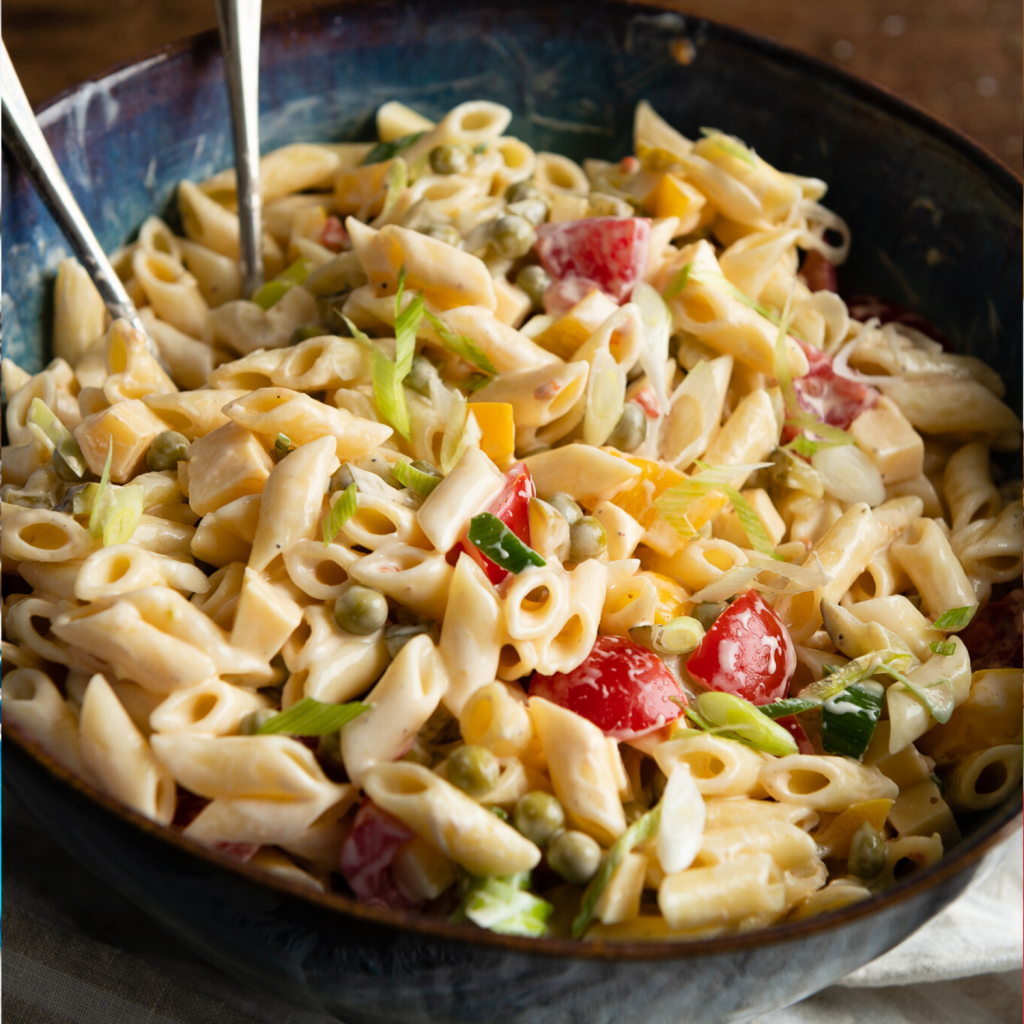 Schüssel mit cremigem vegetarischem Nudelsalat (Penne), gemischt mit Erbsen, Tomaten, gelber Paprika und Frühlingszwiebeln.