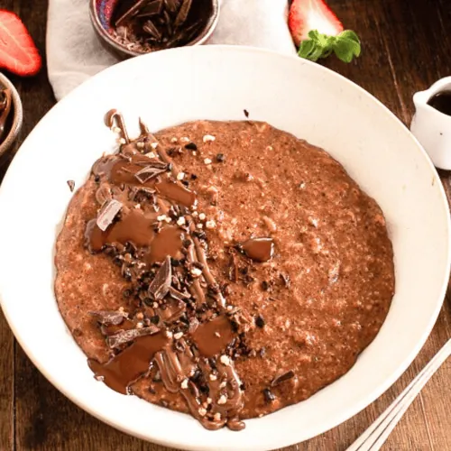 Porridge Rezept für Schokoporridge mit Nussnus, Kakaonibs und Schokosplittern.