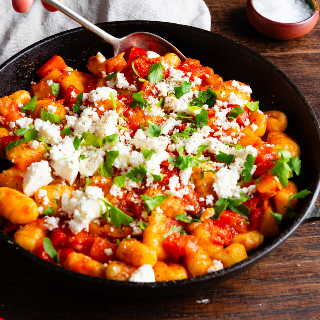 Fertig in nur 10 Minuten handelt es sich bei diesem Rezept um echtes, gesundes Comfort-Food! Wer mag, kann die Gnocchi-Pfanne auch mit Zucchini oder Aubergine zubereiten und dadurch noch ein bisschen mehr Gemüse unterbringen.
