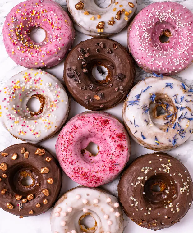 Leckeres Donuts Rezept für Donuts aus dem Backofen. Frisch aus dem Backofen, fertig in weniger als 30 Minuten und mit drei leckeren Glasuren im Video.
