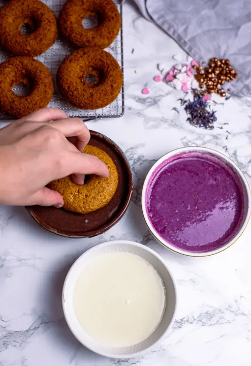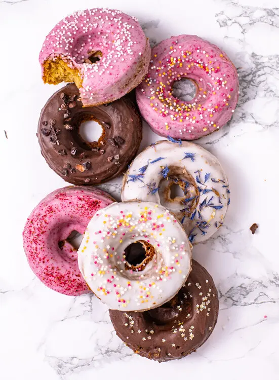 Beim Dekorieren der Donuts sind Deiner Fantasie dann keine Grenzen gesetzt und Du kannst mit Streuseln, Schokolade und Co. loslegen. Sehr lecker sind auch getrocknete Blüten auf den Donuts.