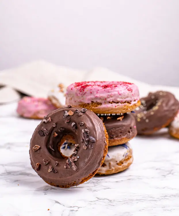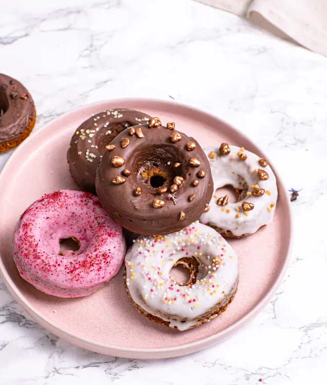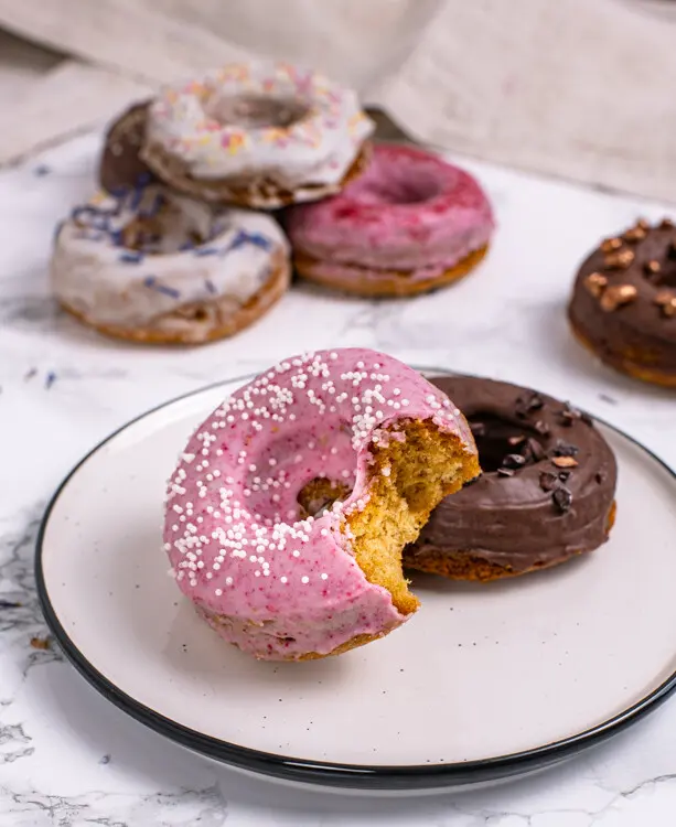 Im Backofen benötigen die Donuts etwa 18 Minuten. Die genaue Backzeit hängt wie immer von Deinem Ofen ab. Die Stäbchenprobe hilft wie immer dabei, zu bestimmt, ob die Donuts durchgebacken sind.
