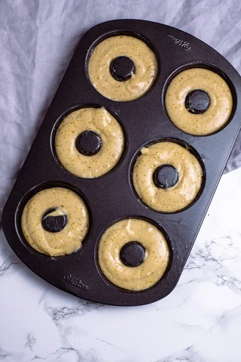 Damit die Donuts nach dem Backen auch hübsch aussehen ist es wichtig, dass Du die Förmchen nicht zu voll füllst.