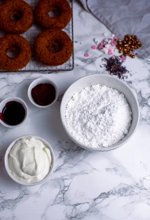Sind die Donuts aus der Form befreit und etwas abgekühlt, ist es Zeit sie zu glasieren. Dafür benötigst Du neben Puderzucker etwas Joghurt, Beerenpüree und Kakao.
