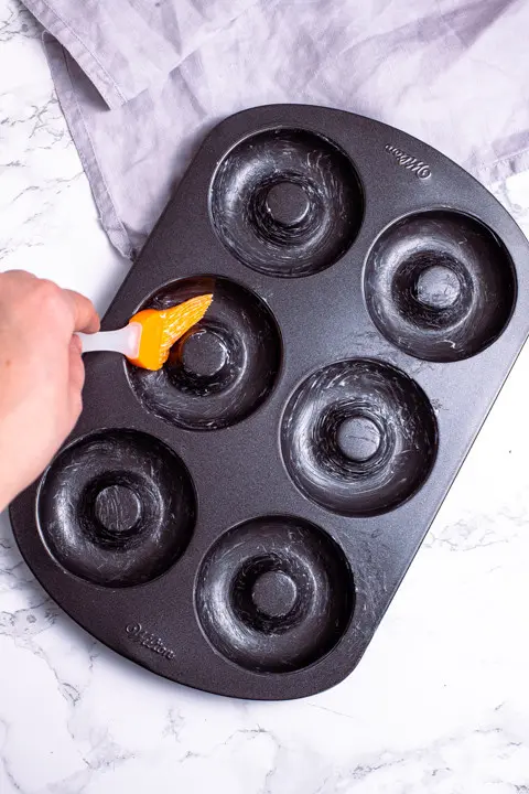 Damit sich die Donuts nach dem Backen auch gut lösen lassen, ist es wichtig, dass Du die Mulden der Donut-Form vorab gut mit Butter bestreichst.