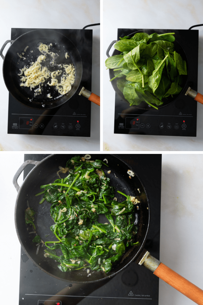 - Blattspinat und Zwiebeln werden in der Pfanne angebraten und sind später das Bett für das pochierte Ei. Du kannst sowohl frischen als auch TK-Spinat verwenden.