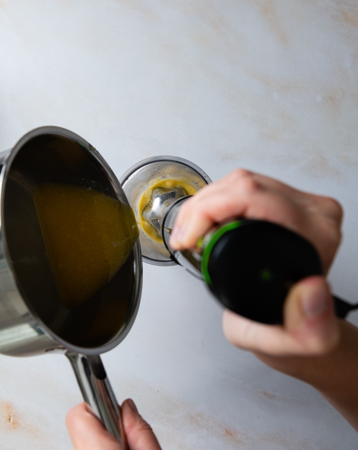 - Gieße die Butter nach und nach in das Gefäß mit den Eigelb und achte darauf, dass die Butter nicht zu heiß ist. So stellst du sicher, dass die Sauce Hollandaise nicht gerinnt. Sollte das doch passieren, musst du NICHT von vorne anfangen, sondern kannst sie mit ein paar Tricks und Kniffen ganz einfach wieder retten. Mehr dazu findest du im Sauce Hollandaise Grundrezept.