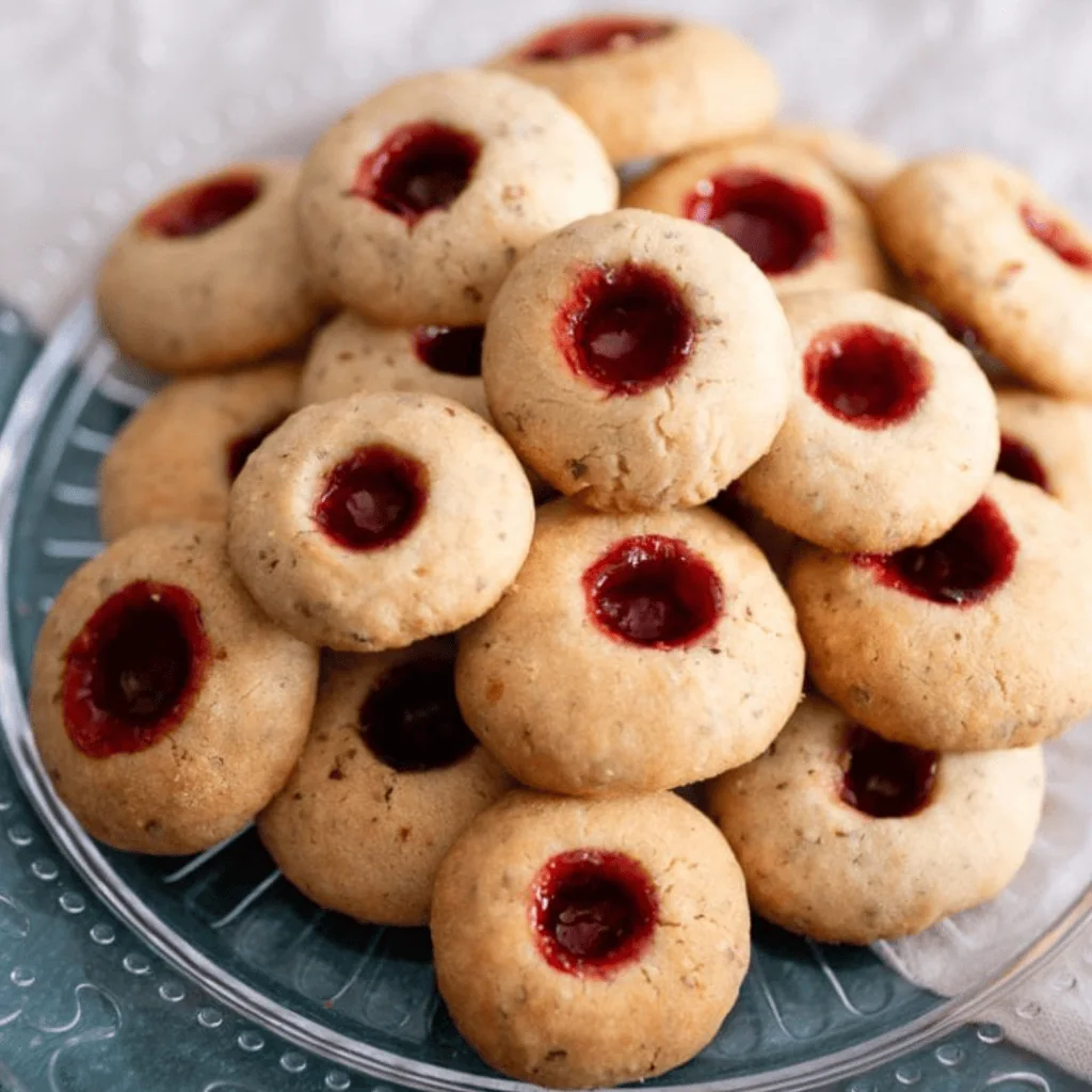 Die Engelsaugen Plätzchen aus Omas Rezept, liegen auf einem Teller.