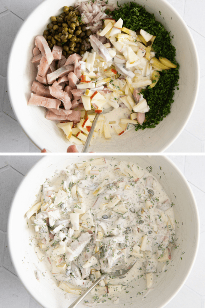 - Mische die Sauce mit den restlichen Zutaten. Lass den Heringssalat am besten 1-2 Stunden im Kühlschrank ziehen und schmecke ihn dann nochmal ab.