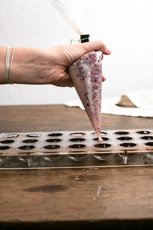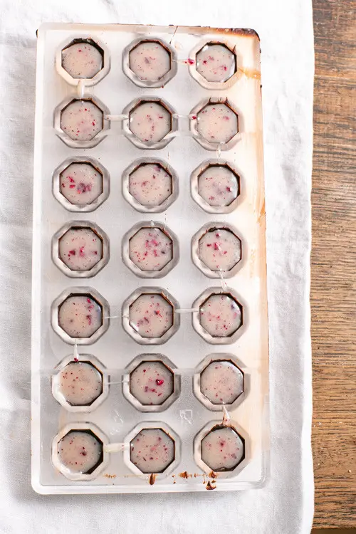 - Alle Zutaten außer dem gefriergetrockneten Himbeeren für die Füllung über einem Wasserbad schmelzen. Sobald alles geschmolzen ist, die Himbeeren unterheben. Füllung kurz abkühlen lassen und in die Hohlräume der Form füllen. Für mindestens 2 Stunden in den Kühlschrank stellen.