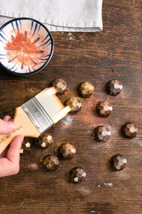 - Die restliche Schokolade vom gießen der Hohlkörper erneut schmelzen und die Pralinen damit verschließen. Pralinen über Nacht ins Gefrierfach stellen. Zum herauslösen die Form aus dem Gefrierfach nehmen und gleich stürzen. Pralinen mit goldener und roter Pulverfarbe nach Belieben dekorieren.