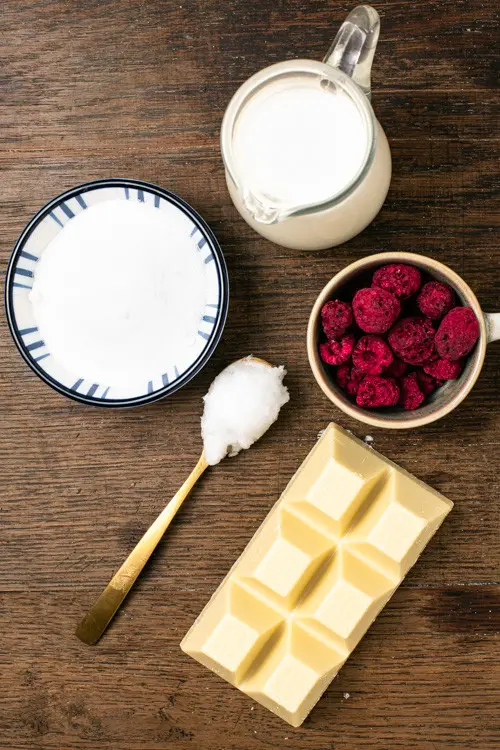 Neben der besten Schokolade benötigst Du noch einige weiteren Zutaten für die Füllung. Das sind Sahne, Kokosöl, weiße Schokolade und gefriergetrocknete Himbeeren.