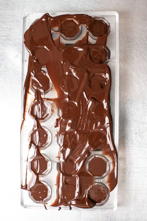 Temperierte Schokolade zieht sich beim Abkühlen minimal zusammen. Nur so lassen sich die Pralinen auch aus der Form lösen.