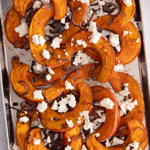 Kürbis aus dem Ofen mit Feta auf einem Blech