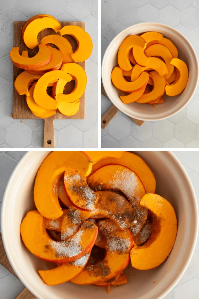 • Vorbereitung: Heize den Ofen vor. Wasche den Hokkaido, halbiere ihn und entferne die Kerne mit einem Löffel. Schneide ihn in gleichmäßige Spalten. Schälen ist nicht nötig!