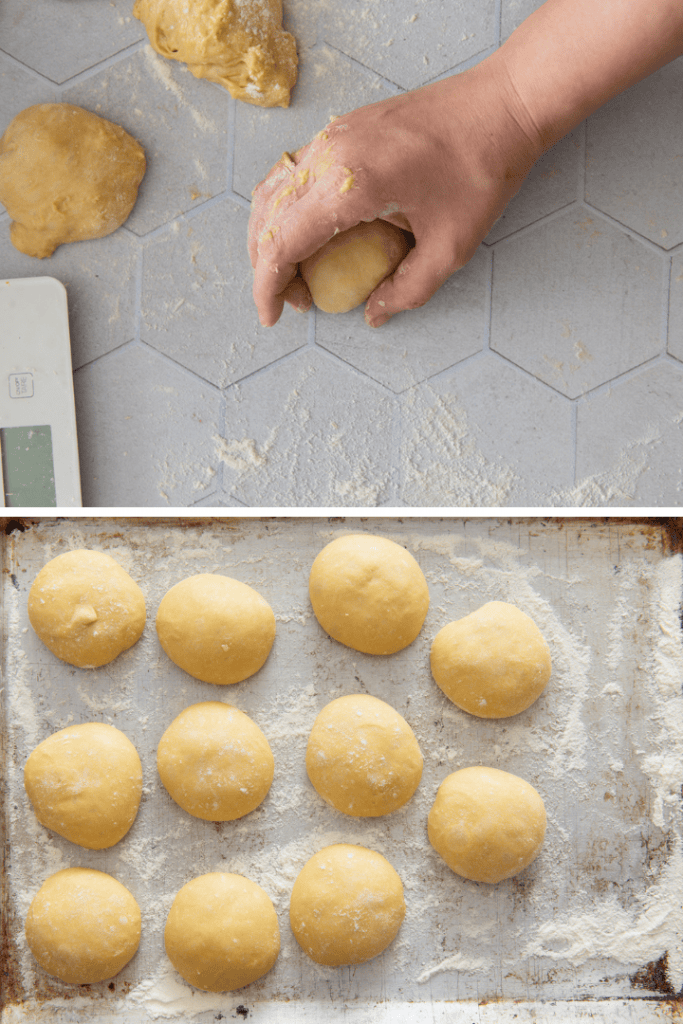 - Dann den Teig aus der Schüssel nehmen und kurz durchkneten. Portionen von je 50-60 g abstechen. Schleife die Teiglinge rund (mit der hohlen Hand auf der Arbeitsfläche kreisen lassen), bis die Oberfläche ganz glatt und gespannt ist. Das ist wichtig für eine schöne Form. Auf ein bemehltes Brett setzen und etwas flach drücken. Die Teigkugeln erneut abdecken und nochmal für 20 Minuten gehen lassen.