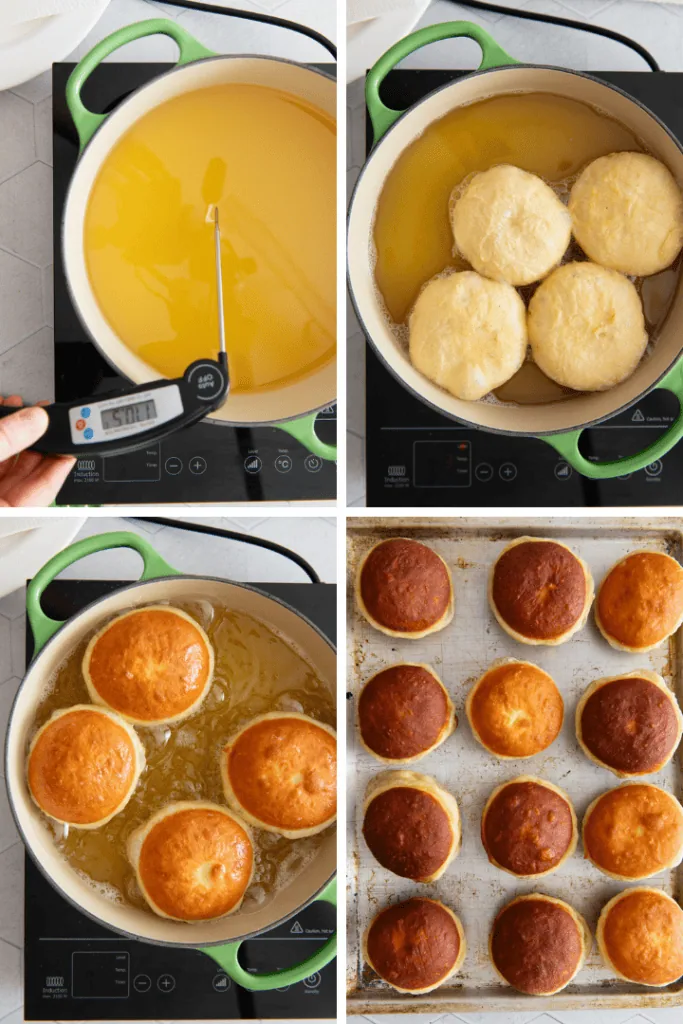 - In der Zwischenzeit das Öl auf 170 °C Erwärmen. Die gegangenen Krapfen mit der schönen (glatten) Seite nach unten zuerst ins Öl geben. Deckel drauf und für 2-3 Minuten backen lassen. Decken entfernen, die Krapfen umdrehen und ohne Deckel nochmal 3 Minuten die andere Seite backen.