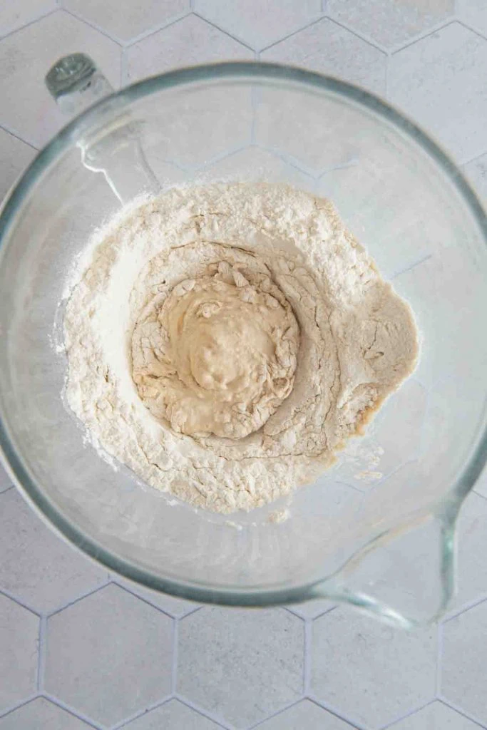 - Mehl in eine große Schüssel geben, in der Mitte eine Mulde bilden und die Hefemischung hineingeben. Mit etwas Mehl vom Rand zu einem weichen Teig verrühren und mit etwas Mehl bestäuben. Mit einem sauberen Geschirrtuch zudecken und an einem warmen Ort 30 Minuten gehen lassen.