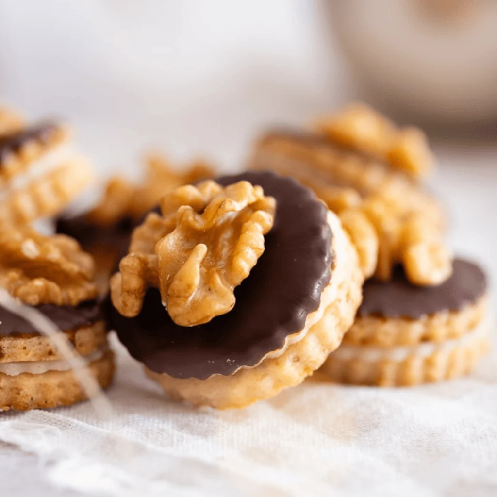 Omas Rezept für aromatischen Walnuss Marzipan Plätzchen. Die zarten Walnuss Plätzchen werden mit einer feinen Schicht Marzipan gefüllt und mit dunkler Schokolade verfeinert – ein absoluter Hochgenuss!