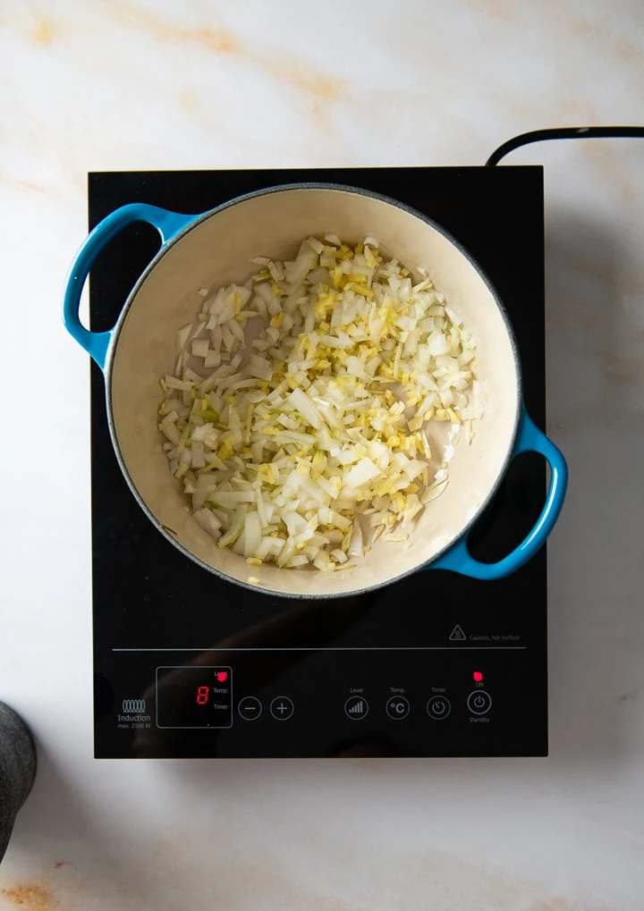 - 1 Zwiebel fein hacken, 1 Knoblauchzehe und 2 cm Ingwer fein reiben. In einem Topf 1 EL Pflanzenöl erwärmen. Zwiebel, Knoblauch und Ingwer in den Topf geben und glasig dünsten. Dann die Gewürze dazugeben und etwa 30 Sekunden lang anbraten lassen. Derweil 4 Tomaten grob hacken und in den Topf geben. Einige Sekunden mit anbraten, dann mit etwa 150 ml Wasser ablöschen, 1 Zimtstange hinzugeben und etwa 10-15 Minuten bei kleiner Flamme köcheln lassen.