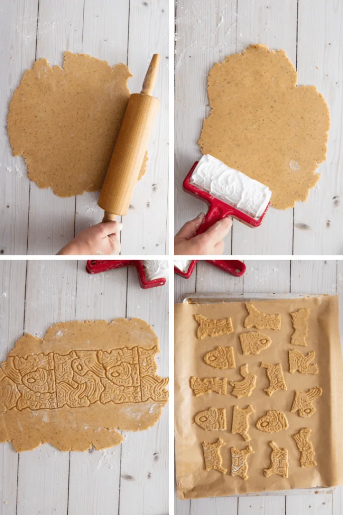 - Rolle den Teig etwa 4-5 mm dick aus und Forme die Spekulatius mit einer Spekulatius-Walze oder speziellen Model. Lege sie dann auf die vorbereiteten Bleche und pinsle sie mit etwas Milch ein.