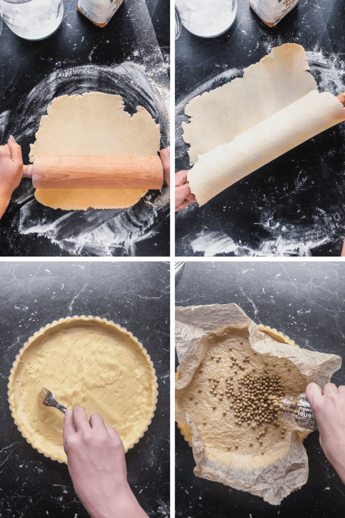 - Rolle den Teig aus, lege ihn in die vorbereitete Backform und drücke ihn fest. Belege den Teig mit etwas Backpapier und beschwere ihn mit Blindback-Gewichten oder trockenen Hülsenfrüchten.