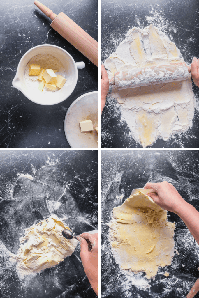 - In einer Schüssel Zucker, Salz und Mehl vermengen. Butter in etwa 5mm dicke, quadratischen Scheiben schneiden. Zu den trockenen Zutaten geben und kurz vermengen. Masse auf die saubere Arbeitsplatte geben. Mit einem gut bemehlten Nudelholz die Butter zu langen Streifen rollen (nur von oben nach unten rollen). Zutaten mit einer Teigkarte zur Mitte hin einklappen. 3 EL Eiswasser dazu geben und untermengen. Teig dann erneut der länge nach mit einem gut bemehlen Nudelholz ausrollen. Erneut zur Mitte hin einklappen und ein drittes mal ausrollen. Teig wieder einklappen. In Frischhaltefolie oder ein Bienenwachstuch einschlagen und für mindestens eine Stunde im Kühlschrank ruhen lassen.