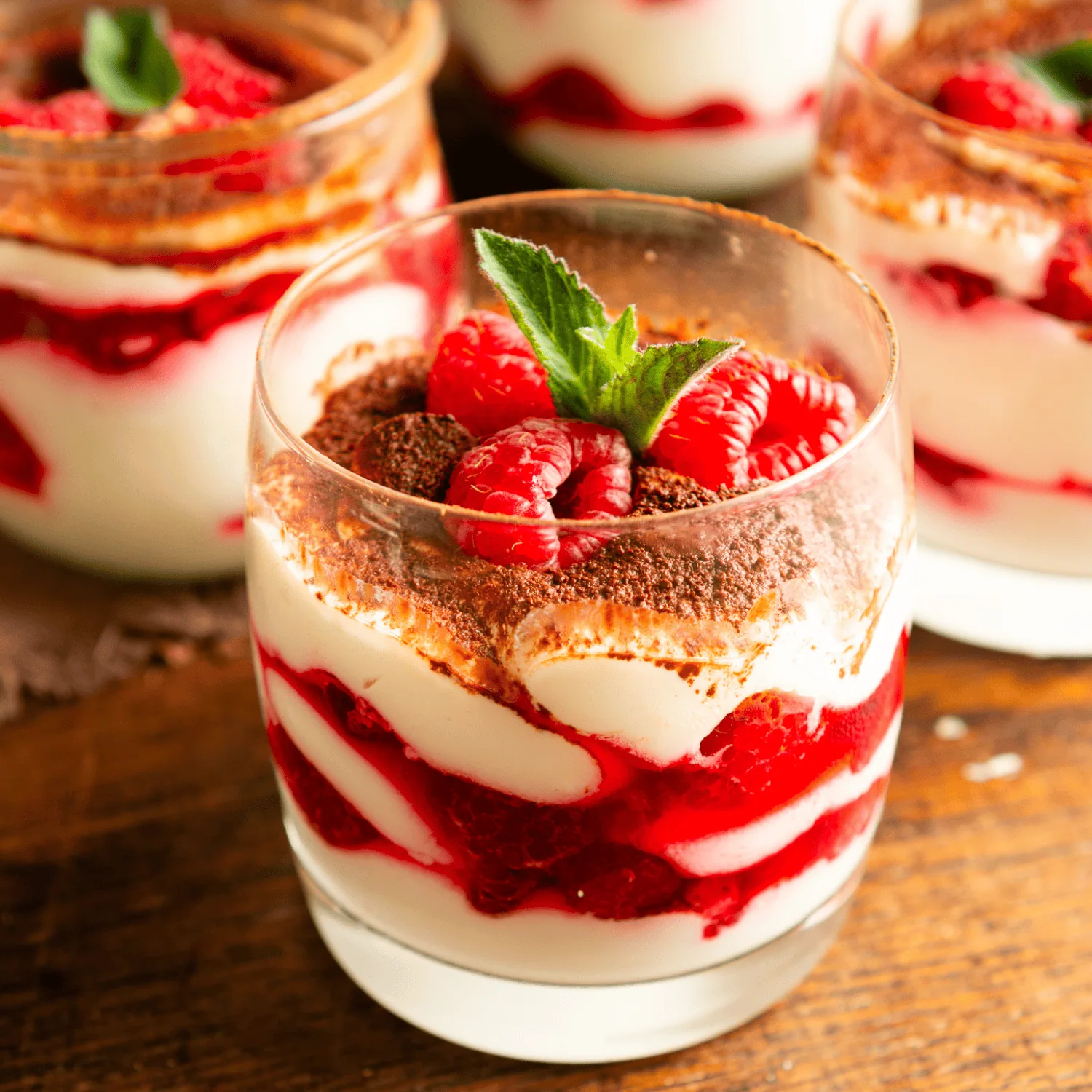 Leckerer Mascarpone Nachtisch im Glas mit gefrorenen Früchten