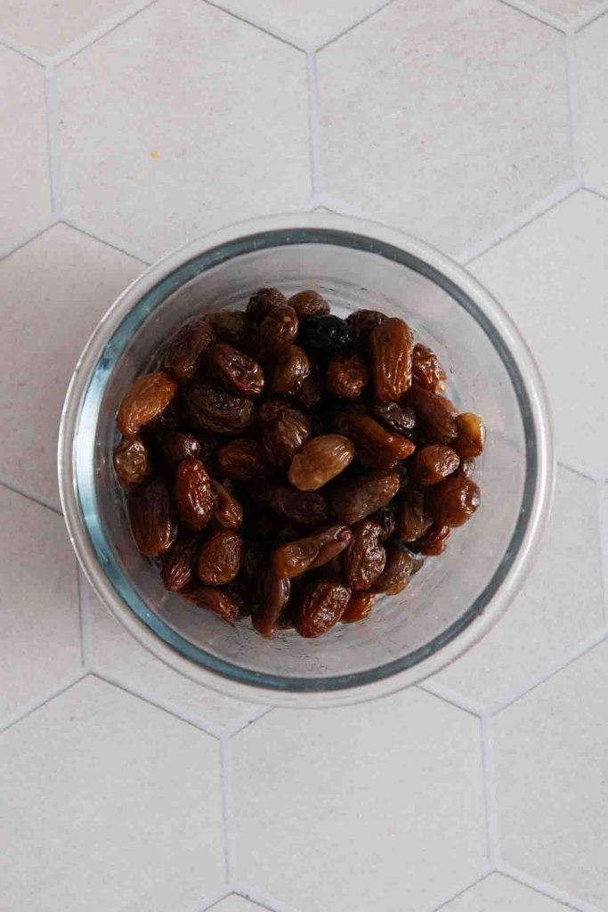 - Rosinen einweichen: 150 g Rosinen in eine kleine Schüssel geben und mit 100 ml lauwarmes Wasser übergießen. Mindestens 1 Stunde (gerne auch über Nacht) ziehen lassen, damit sie das Wasser komplett aufsaugen können.