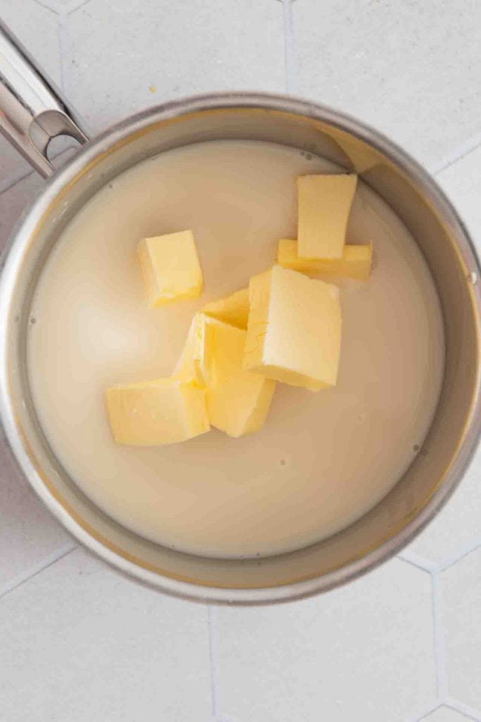 - Die Flüssigkeit: 150 ml Milch in einen kleinen Topf geben und 80 g Butter in Stücken hinzufügen. Auf dem Herd bei niedriger Hitze erwärmen, bis die Butter geschmolzen ist. Achtung: Die Mischung vom Herd nehmen und abkühlen lassen! Sie darf nur lauwarm (max. 40 °C) sein, wenn sie später zur Hefe kommt.