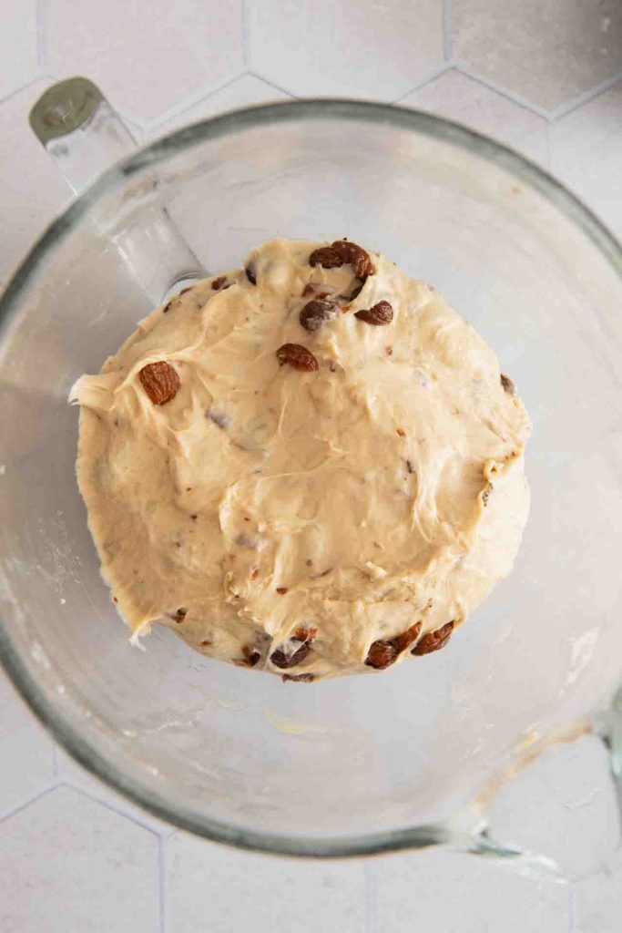- Kneten: 500 g Weizenmehl, 80 g Zucker, 2 Bio-Eier und 1 Prise Salz in eine große Rührschüssel geben. 21 g frische Hefe mit den Fingern möglichst klein darüber krümeln. Die abgetropften Rosinen sowie die lauwarme Butter-Milch-Mischung dazugeben. Alles mit dem Knethaken der Küchenmaschine für ca. 10 bis 15 Minuten zu einem extrem geschmeidigen, weichen Teig verkneten, der sich vom Schüsselrand löst.
