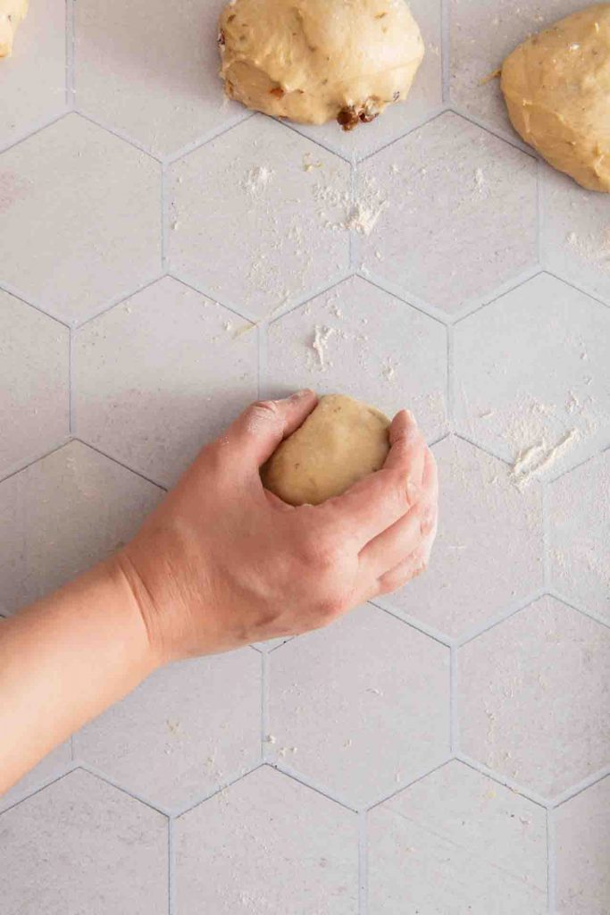 - Formen (Schleifen): Den aufgegangenen Teig auf eine leicht bemehlte Arbeitsfläche geben und in 12 gleich große Portionen teilen. Jede Portion mit den Händen zu straffen, runden Teigkugeln formen (die Oberfläche sollte richtig schön gespannt sein, damit sie beim Backen nicht flachlaufen).