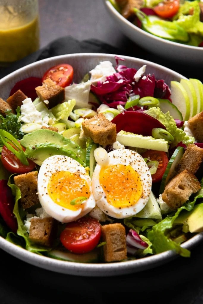 Wenn mir der Sinn nach einem leichten Mittagessen steht, dann bereite ich besonders gerne die Salad Bowl zu! Mit Ei, Avocado und knusprigen Croûtons ist sie unwiderstehlich lecker und sorgen dafür, dass die Salad Bowl auch ein echter Sattmachersalat ist. Wenn du magst, kannst du mit knusprigen Tofu oder Fetawürfeln noch etwas mehr Protein im Salat unterbringen.