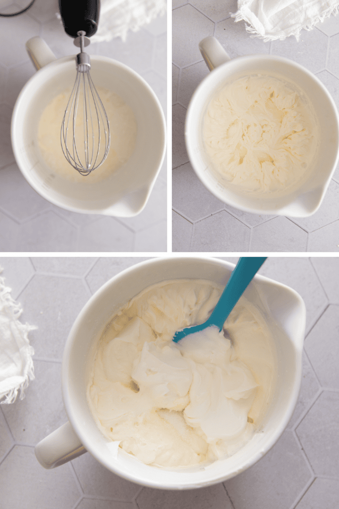 - Schlage 250 ml Sahne steif und vermische sie dann mit 250 g Quark, 250 g griechischen Joghurt sowie 50 g Zucker, 1 TL Vanilleextrakt, 1 msp. Zitronenabrieb und dem Saft einer Zitrone.