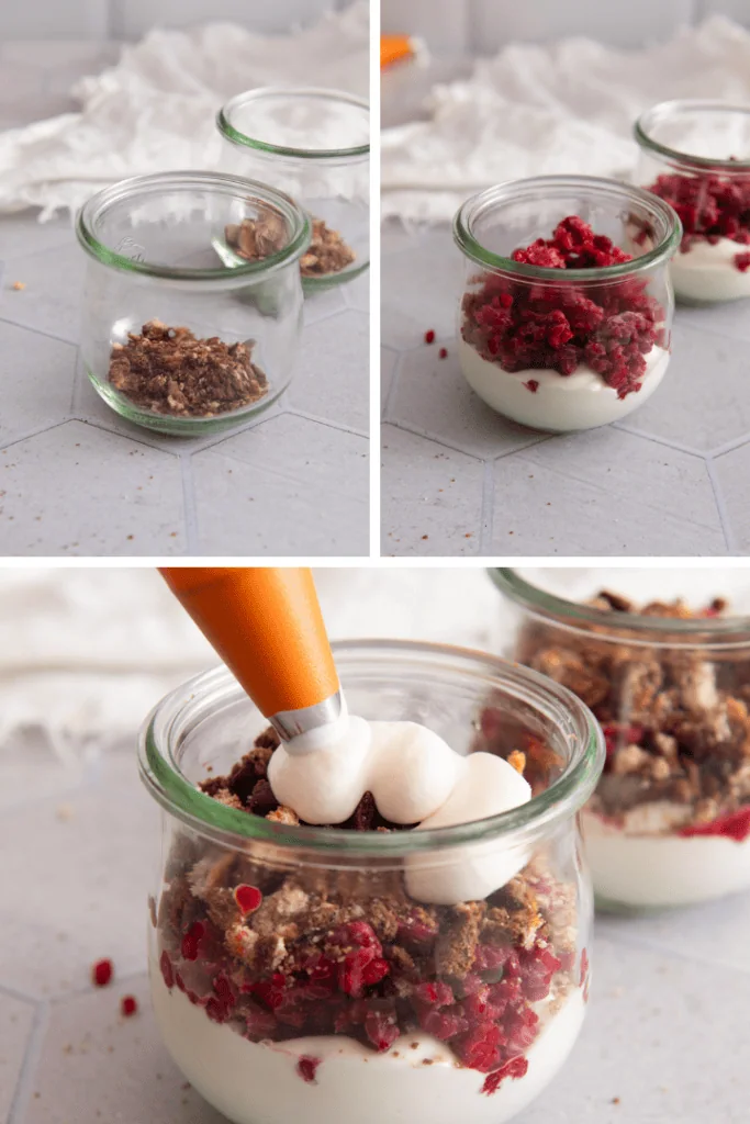 - Zerkrümle die Kekse. Gib eine Schicht der Kekse in in jedes Glas. Gib dann mit einem Löffel oder einem Spritzbeutel eine Schicht Creme ins Glas, gefolgt von einer Schicht Obst. Es folgt wieder eine Schicht Kekse, Creme, Obst usw. bis das Glas voll ist.