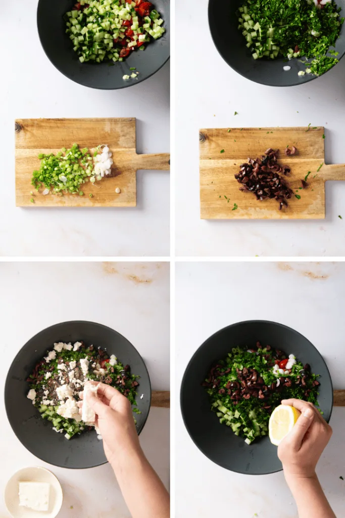 - Schneide die Frühlingszwiebeln in feine Ringe, den Feta und Würfel und hacke die Oliven. Gib alles in eine Schüssel und gib Zitronensaft und Olivenöl dazu. Würze den Salat mit Salz und Pfeffer.