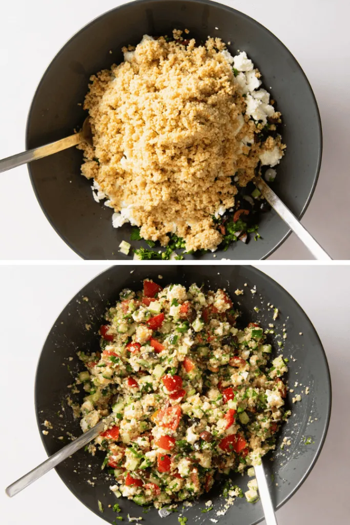 - Alles verbinden: Lockere den fertigen, leicht abgekühlten Couscous mit einer Gabel auf und gib ihn in eine große Schüssel. Füge das geschnittene Gemüse, die Kräuter, Oliven und den zerkrümelten Feta hinzu. Mit Olivenöl und Zitronensaft beträufeln und alles gut vermengen.