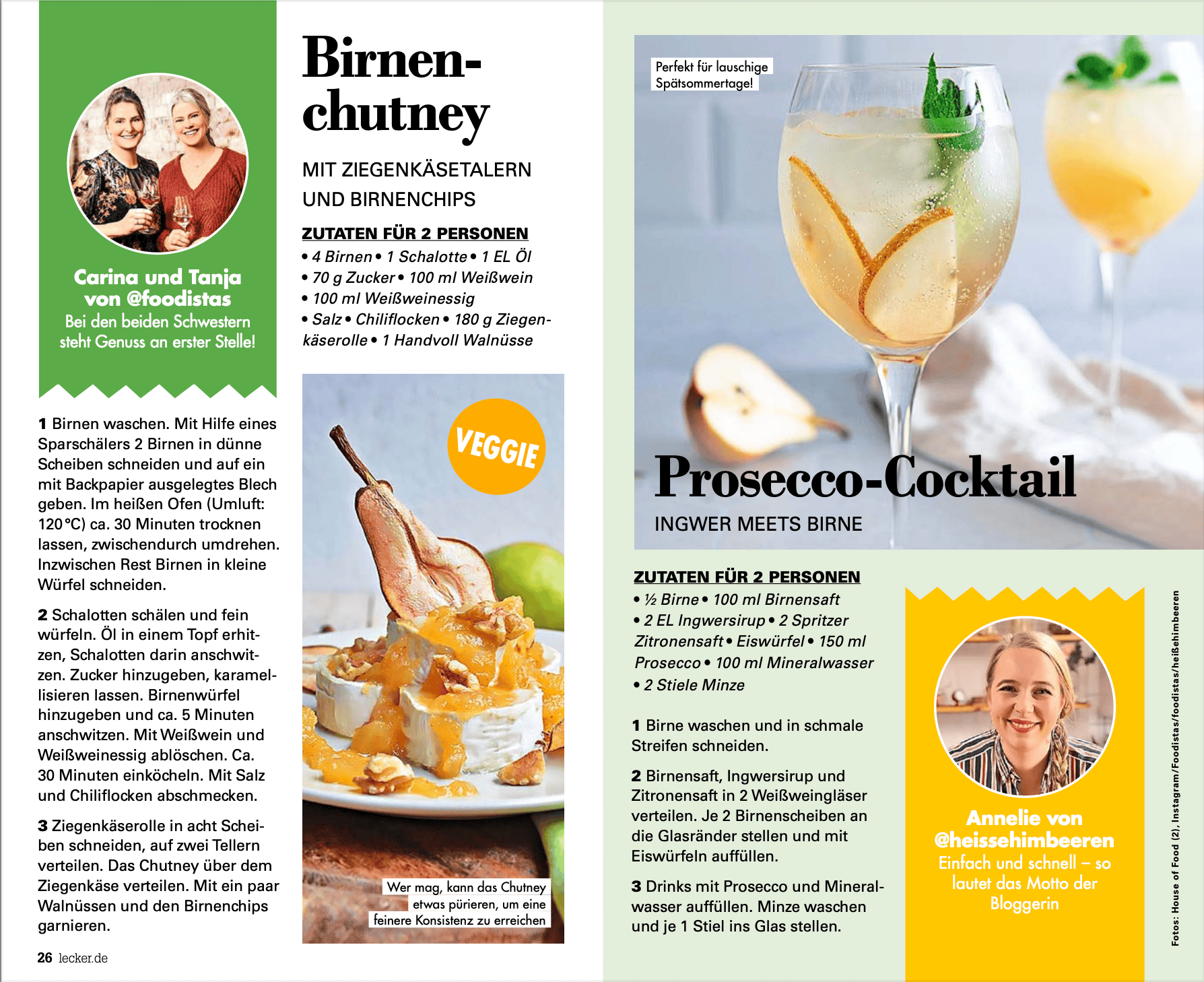 In den letzten Jahren durfte ich als Expertin für die dpa zur Verfügung stehen, meine Rezepte und Bilder wurden in der Zeit (seit 2018 regelmäßig), der Weser Kurier (2023), der Rheinischen Post (2024), und im KüchenDesignMagazin (ab 2019 regelmäßig) veröffentlicht. Den Anfang machte aber 2016 Antenne Bayern und German Food Blogs, die mich als neueste Entdeckung unter den Foodblogs aus Bayern erwähnt haben. Im September 2025 erschien mein Prosecco Cocktail mit Ingwer und Birne in der LECKER Ausgabe Nummer 9.