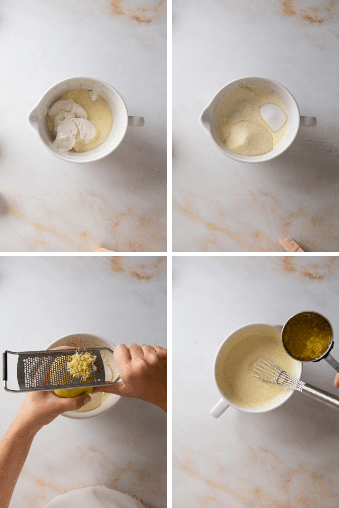 - 80 g Butter auf dem Herd oder in der Mikrowelle schmelzen. In einer Rührschüssel 100 g Schlagsahne, 600 g Quark , 300 g Frischkäse und 150 g Zucker verrühren. 100 g Grieß, 1 Päckchen Vanillepudding und 10 g Backpulver dazu geben. Zu einem glatten Teig verrühren. Dann den Abrieb von 1 Zitrone, 1 TL Vanilleextrakt und 1 Prise Salz sowie die geschmolzene Butter zufügen.