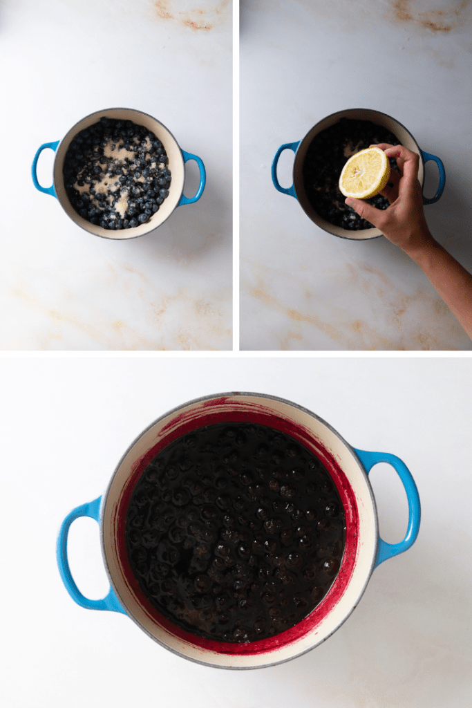 - Derweil die restlichen 200 g Blaubeeren mit 2 EL Zitronensaft und 70 g Zucker In einen Topf geben und etwa 20 Minuten köcheln lassen, bis ein sämiges Heidelbeerkompott entstanden ist.