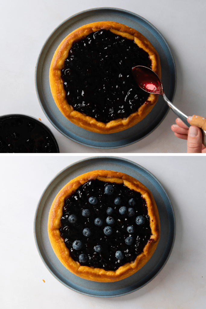 - Nun das Heidelbeerkompott in die Mitte des Kuchens geben. Ganz nach Wunsch frische Blaubeeren darauf verteilen und bis zum Servieren wieder in den Kühlschrank stellen.