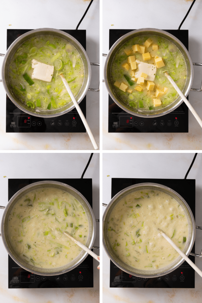Vegetarische käse lauch suppe mit schmelzkäse.