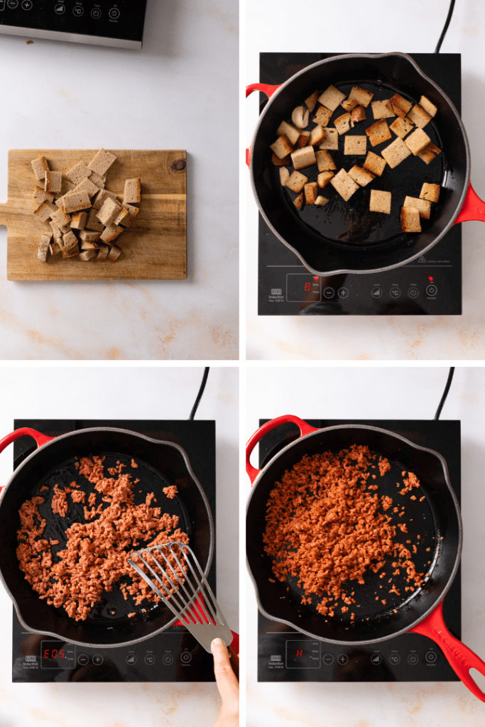 • Als Topping das veggie Hack in einer Pfanne mit etwas Öl anbraten. Mit Salz und Pfeffer würzen. Für die Croutons das Schwarzbrot in Würfel schneiden, in einer Pfanne mit Öl, Salz und Knoblauch knusprig anbraten.