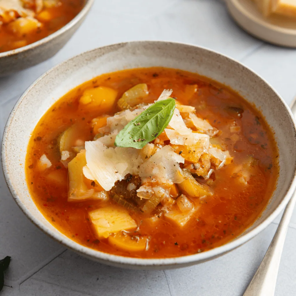 Eine italienische Minestrone vegetarisch steht auf dem Tisch. Auf der Minestrone liegt ein Basilikumblatt.