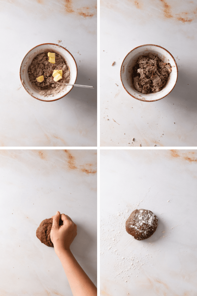 Weizenmehl in eine Schüssel geben. Salz, optional Kakao und Instant Espressopulver dazu geben sowie Zucker. Butter hinzufügen und zwischen den Fingern zerreiben bis die Butter sich gut verteilt hat, nun Masala und Ei dazu geben. Zu einem glatten Teig verkneten. Teig gut zugedeckt mindestens 1 Stunden im Kühlschrank ruhen lassen.