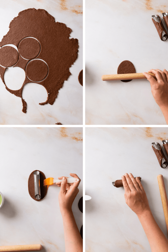 In einem großen Topf das Pflanzenöl auf etwa 160 °C erwärmen. Derweil den Teig ausrollen und 12 cm große Kreise ausstechen. Cannoli Röhrchen mit Öl bestreichen. Nun je einen Cannoli Röhrchen in die Mitte eines Teigkreises legen. Eine Seite mit etwas Eiweiß bestreichen und um das Röhrchen herum rollen. Es kann hilfreich sein, die Teigkreise mit einem kleinen Nudelholz etwas länglicher zu rollen.
