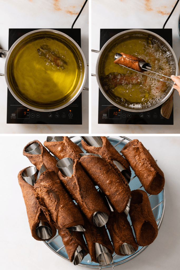So weiterverfahren bis der ganze Teig verarbeitet ist. Cannoli dann nach und nach im heißen Fett ausbacken bis die goldbraun sind. Das dauert etwa 5 Minuten. Dabei gelegentlich wenden. Dann vorsichtig aus dem Öl nehmen und auf einem Gitter mit etwas Küchenrolle das restliche Fett abtropfen lassen. Komplett abkühlen lassen, dann vorsichtig die Cannoli Röhrchen entfernen.